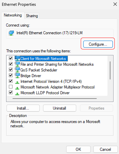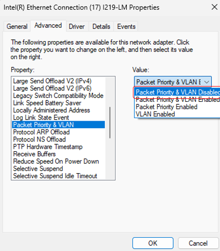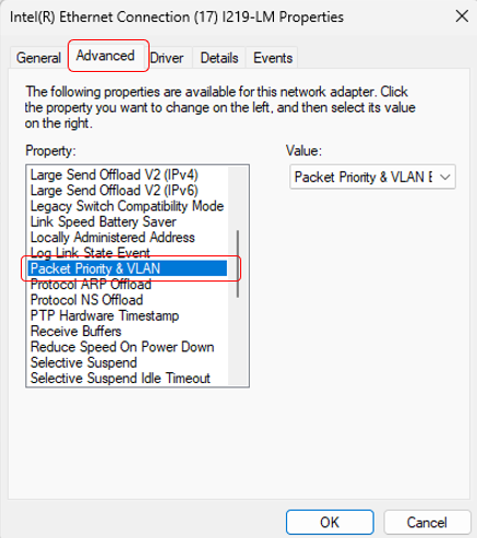 • Go to the “Advanced” tab, and then look for any option related to “VLAN ID” or “Priority and VLAN” and ensure it is disabled or set to 0 (which means untagged).