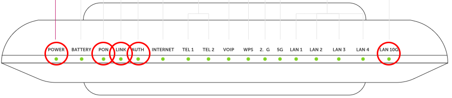 All 5 red-circled LEDs should be solid green for Hyperfibre service to function properly.If any are off or blinking, troubleshoot using the table above or escalate to us.