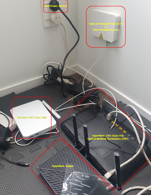 The image below shows a typical Hyperfibre setup with key components labelled for reference. This guide helps with identifying which device to reboot and which one should not be touched during troubleshooting.